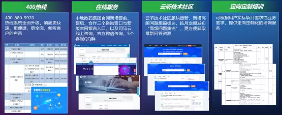 除了提供400热线、官网、QQ、微信等在线服务、GIS技术水平权威认证以外,我们还创新推出了云听技术社区、定向定制的培训服务以及各项品牌服务活动等服务模式,新增高频问题集锦板块和新版官网留言入口,使服务模式多元化,让MapGIS服务应您所需。