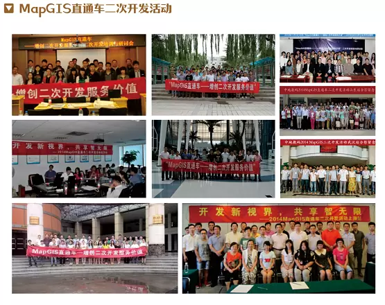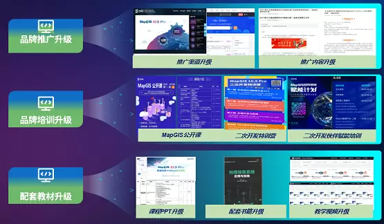 同时,我们也全力推进品牌服务升级。首先在品牌推广方面,持续拓宽推广渠道和丰富推广内容,您可以通过关注官方公众号“中地数码MapGIS”以及“MapGIS那些事儿”来获取MapGIS最新服务咨讯。同时加强品牌培训服务,每月一期的MapGIS产品公开课、二次开发特训营、二次开发伙伴赋能培训等培训课程服务,提供从产品到开发的全方位培训支持。相应地,配套教材也将持续优化与更新,课程PPT、配套书籍、教学视频等开放资源助力您自主学习MapGIS产品。