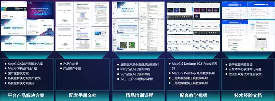 三十年技术发展与服务实践,让我们沉淀出了丰富的产品。紧跟产品升级的步伐,平台产品解决方案、配套手册文档、精品培训课程、配套教学视频和技术经验文档等平台工具产品配套同步升级,全新打造的精品培训课程帮助您对MapGIS产品从入门到精通,均可通过资源共享渠道获取。