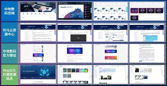 我们开放了多个官方资源获取渠道,中地数码官网、司马云资源中心、中地数码官方微信等为您提供了丰富多样的线上技术资源,包括精品视频课程与各类文档资料,让平台的使用与开发资料获取更简单。最全、最新的MapGIS资源已经实现资源手机端全共享,让MapGIS服务触手可及。