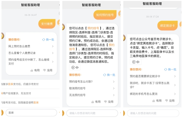在系统上线后,患者可以输入咨询问题,也可以通过语音交互的方式获取智能客服给出的指引,智能回复后还会自动推出关联问题的链接,如有需要可以点击其他问题获取指引。