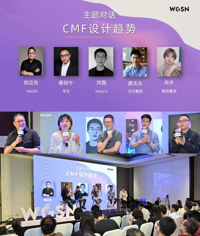 在接下来的“CMF设计趋势”对话环节,WGSN战略渠道总监郑迈克先生和来自华为2012实验室UCD中心可用性设计专家蔡阳午先生、Vesync创意设计负责人刘磊先生、合元集团高级IDC总监龚天永先生、美的中央研究院CMF负责人肖乡女士,分别针对各自品牌所处于的细分市场和具体品类的产品功能规划、CMF设计、包装设计、UI及UX设计等进行了非常具体和有针对性的实践经验分享。