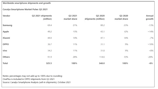 根据Canalys日前公布最新数据显示,今年第三季度全球智能手机出货量3.25亿台,其中OPPO位居全球第四,同比增长18%,在前五手机品牌中增速第一。在全球芯片短缺、行业出货量下滑6%的大背景下,OPPO取得这一成绩实属不易。