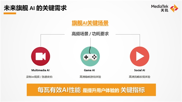 AI既是硬件也是软件,同样会考虑功耗,因此如何高效运用AI技术为用户带来体验提升,对行业来说是机遇也是挑战。联发科认为在拍照、摄像、显示、游戏等高频应用场景中,相比峰值AI算力,每瓦有效AI性能才是确保并提升用户长时间稳定体验的关键指标。简单来说就是通过高能效AI设计,实现运算速度更快,功耗更低,从而让AI在更广泛、更深入的使用场景下发挥巨大作用,这也是近年来联发科天玑5G移动平台AI技术取得出色成绩的重要原因。