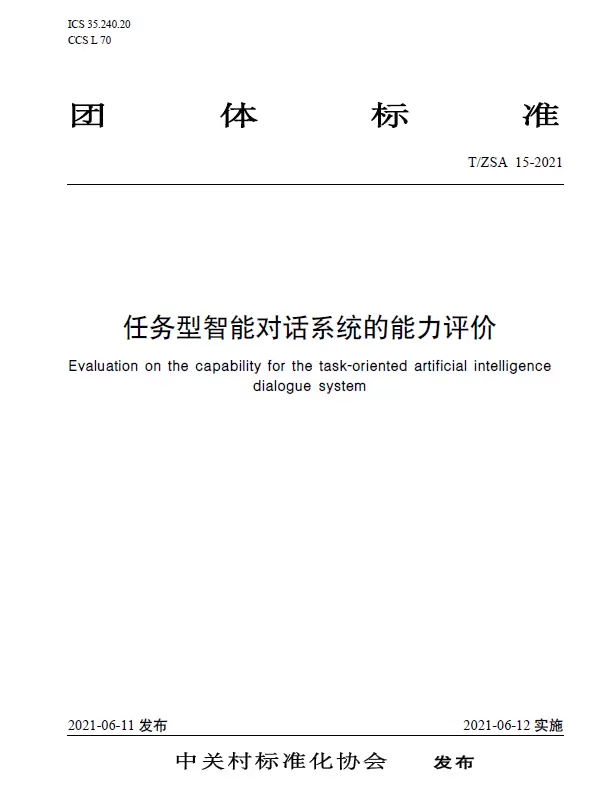 近期,由中关村标准化协会牵头并批准发布的T/ZSA 15-2021《任务型智能对话系统的能力评价》团体标准正式实施。该标准由中国信通院、联想、百度、小米、影谱科技等公司共同参与起草,对构建兼容社会规范的、安全的、系统扩展性良好的人工智能设施具有重要意义。