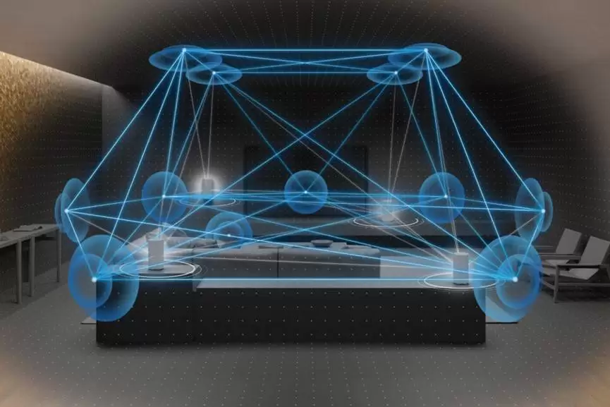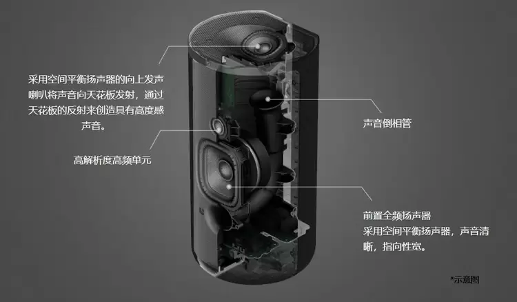 在360 SSM技术的加持下,HT-A9利用墙壁和天花板的声音反射,创造出多达12个“幻象音箱”的沉浸音场。音箱正面的上下方各有1个麦克风,用于接收音频信号,再反馈给解码控制器,通过这种声音反馈和360度空间声场,实现自动修正音场、呈现出沉浸式音效。