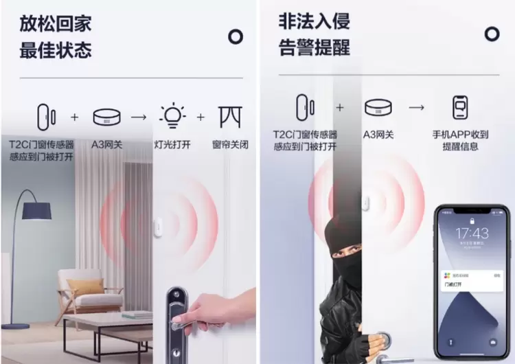 如用户外出工作时,T2C门窗传感器被打开,可实时联动摄像机抓拍、录像;下班回家时,T2C门窗传感器感应到门被打开,灯光自动亮起,窗帘关闭;夜间起床时,T1C人体移动传感器联动卧室开关,暖灯自动亮起,并在感应到无人时自动关灯,生活处处彰显智能范。