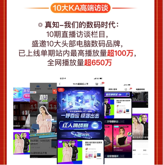 本次京东11.11相对于以往,更是带来了花样玩法,和广大消费者一起玩一起嗨。可以看到,在11.11期间,京东电脑数码打造盛大的“红人直播盛典”,超120位红人带货5大品类,直播时长累计超1750小时,成交额更是同比增长190%。同时本次开启了“10大KA高端访谈”新形式的展现,通过盛邀10大头部电脑数码品牌,打造《真知-我们的数码世代》栏目,已上线的单期站内最高播放量超100万,全网播放量超650万,深受广大用户尤其Z世代群体的欢迎。