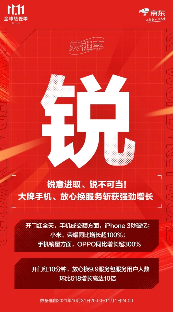 11月1日,本年度京东11.11全球热爱季迎来盛大开门红,在正品好物、福利钜惠和贴心服务的“助攻”下,手机品牌开门红首日火力全开、再创新高! Apple、小米、OPPO、荣耀品牌手机满载而归,手机配件和阅读手机等新兴品类涨势喜人,以9.9服务包、以旧换新为代表的手机放心换服务持续走高!火爆的开门红销售表现,持续拉升京东手机的主场氛围,用户也沉浸在京东11.11的品质盛宴之中。