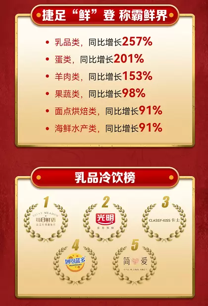 其中,受消费者近年来对营养健康食品的关注,乳品、蛋、羊肉登顶品类榜前三,同比增长分别为257%、201%、153%。从战报各品类的品牌排行榜来看,每日鲜语、光明、卡士、妙可蓝多、简爱,登上乳品冷饮榜前五;湾仔码头、必易阁、思念、广州酒家、三全则位列面点烘焙榜前五;在鸡蛋类排行榜上,新老品牌销量大PK,圣迪乐村登顶榜单第一位,德青源、黄天鹅、正大食品、温氏则依次位列榜单前六;大庄园肉业、东来顺、草原宏宝、宁鑫、恒都牛肉登上羊肉榜前五。