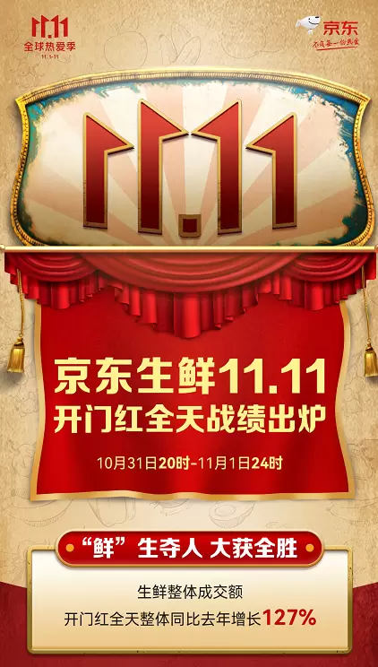 全天成交额同比去年增长127%,京东生鲜11.11首日战绩再创新高