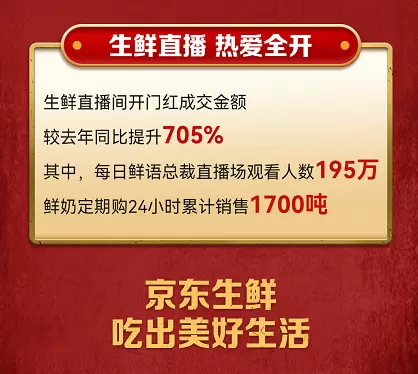 从战报来看,此次京东生鲜直播间开门红全天成交金额较去年同比提升705%!其中,每日鲜语凭借总裁亲自带货,也斩获了喜人销售业绩,数据显示,总裁直播场观看人数高达195万,鲜奶定期购24小时累计大卖1700吨!
