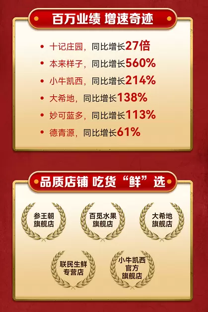 战报数据显示,动物界四大扛把子之一的宿迁”霸王蟹“同比增长400倍;新晋网红贵州修文猕猴桃,同比增长800%;九分甜、一分酸、可以直接“吸”的四川爱媛果冻橙,同比增长227%;即使是来自遥远新疆的库尔勒香梨也交出了满意的答卷,销量同比增长高达200%。
