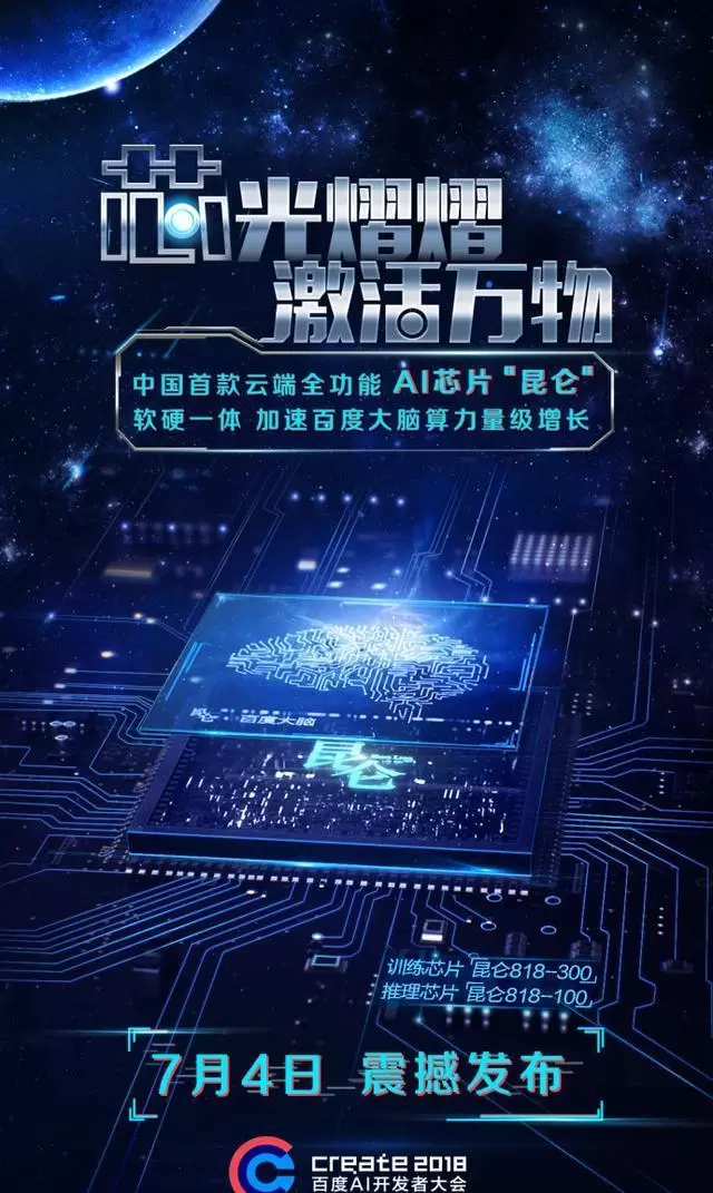 2018年7月4日,百度AI开发者大会于北京国家会议上,百度发布了中国首款云端AI全功能AI芯片“昆仑”,引起国内强烈关注。根据发布会消息显示,“昆仑”是中国在大规模AI运算实践中催生出的芯片,基于百度8年的CPU、GPU和FPGA的AI加速器的研发,20多次迭代而生。