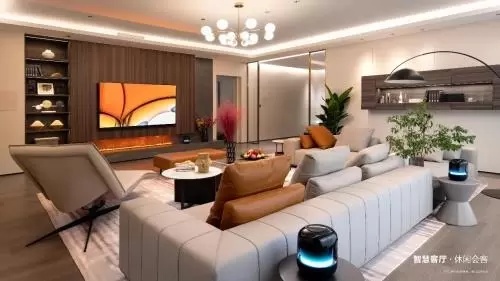 在客厅区域,从归家前奏、温馨回家、沉浸观影、休闲会客、派对模式到安心离家等模式,从下班回家到出门工作的整个过程,摄像头、台灯、窗帘、新风机、空调、扫地机器人等在智慧主机控制下协同联动,满足观影、会客、派对等场景需求。