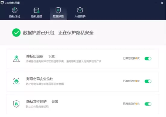 作为本次全新上线的功能,“数据防盾”能够从隐私防追踪、隐私文件保护、账号密码安全监控三个方面为用户数据安全保驾护航。其中,隐私防追踪,可在360网盾安全保护插件的帮助下,干扰浏览器追踪用户浏览记录。与此同时,用户还可通过设置,查看和管理不同浏览器的防护启用状态、反追踪历史记录等等,对个人隐私安全状况做到心中有数。