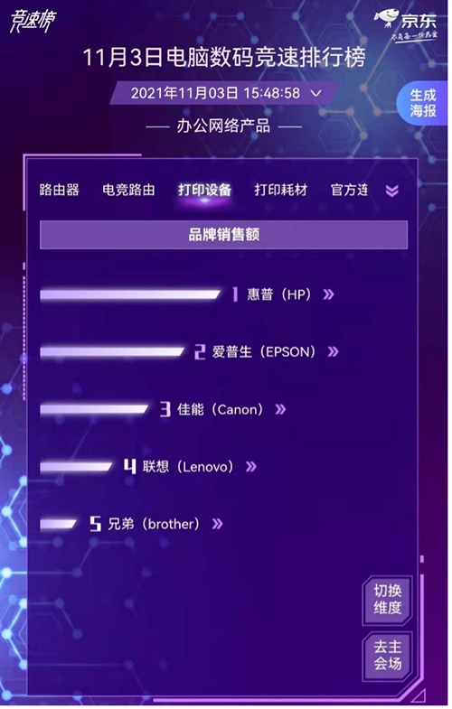随着家庭教育、居家办公等需求的增加,打印机也走进了千家万户,成为居家必备的设备之一。根据调查数据,我国家庭打印机入户率已经从2019年的5%增长到了8%。数据显示,惠普作为全球打印机市场的头号玩家,包揽了11月3日京东电脑数码竞速排行榜打印设备品牌销售额、墨盒打印机单品销量、激光打印机单品销量以及打印耗材四大榜单冠军。