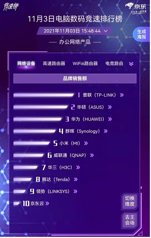 现代生活里,人们已离不开网络。作为知名的网络设备提供商,普联、华硕、华为等企业为人们的生活和工作提供便利,这三家企业也依次占据着11.11电脑数码竞速榜网络设备榜单TOP3的位置。