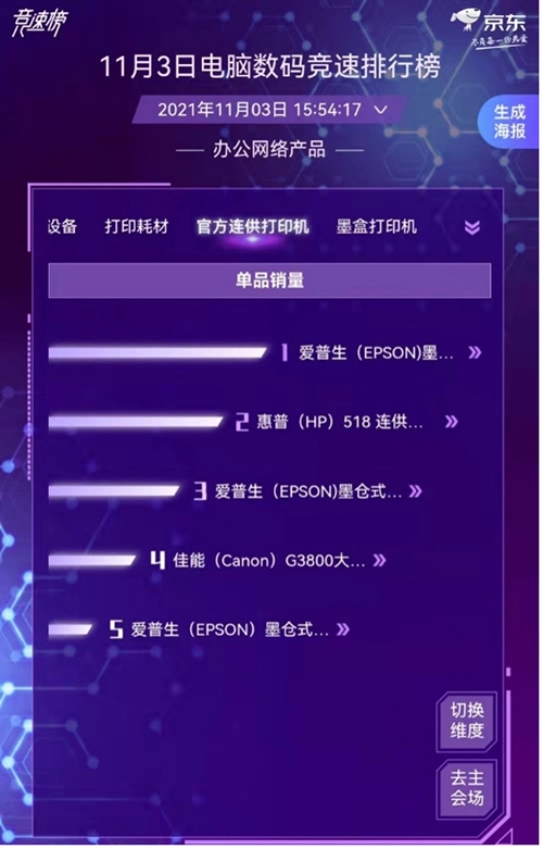此外,在打印设备领域,还有爱普生、佳能与惠普展开激烈角逐。其中,爱普生墨仓式 L3153打印机成为官方连供打印机、墨仓式打印机等榜单中的第一名以及墨盒打印机第三位置;惠普518连供无线打印机、惠普DJ 4825彩色无线喷墨一体机受到用户欢迎;佳能则成为了打印设备以及打印耗材品牌销售额的第二名和第三名。