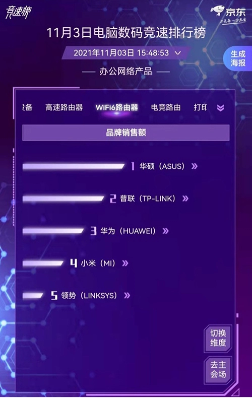 居家办公和学习趋势的到来,让许多家庭对居家无线网络提出了更高要求。WiFi6路由器、以及速度更快的高速路由器成为了更多家庭的选择。数据显示,华硕、普联、华为、小米、领势依次占据11月3日京东电脑数码高速路由器、WiFi6路由器等榜单的前五位置。