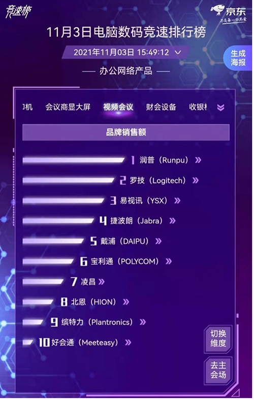 职场的会议场景中,除了更高效的会议平板,包含高清摄影头、全向麦克风、遥控器等在内的专业高清视频会议集成设备也受到企业的青睐。其中润普成为视频会议品牌销售额榜单的冠军,并与罗技、易视讯、捷波朗以及戴浦,依次占据11月3日京东电脑数码竞速排行榜TOP5。