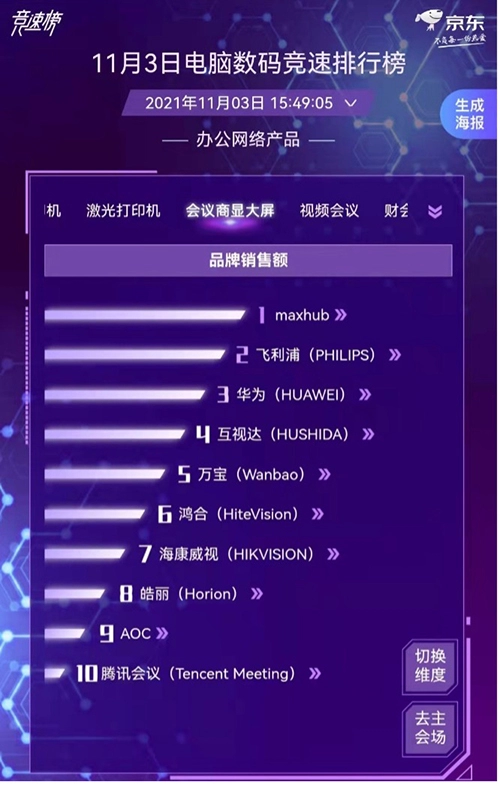 以改善会议体验,提升企业办公及会议效率的会议平板,已成为了企业经营中必不可少的办公设备之一。作为会议平板领域中持续领先的MAXHUB,牢牢占据11月3日京东电脑数码会议商显大屏品牌销售额的榜首位置,飞利浦与华为紧随其后,互视达与万宝分别占据第四名和第五名。