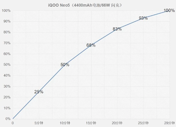另外,iQOO Neo5还内置了4400mAh大电池,配合骁龙870优秀的功耗控制,完全能够满足大多数用户一整天的通勤使用。同时,其还支持66W超快闪充技术,实测电量完全用尽的前提下,仅需10分钟就能将电量从0%充至50%,至快29分钟完全充满,让用户有效避免低电量困扰。