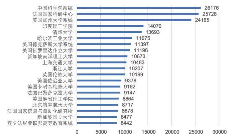 从机构层面,全球参与人工智能相关科研的主要机构中,中国科学院系统、法国国家科学研究中心(CNRS)以及美国的加州大学系统三足鼎立,其20年的论文产出量都超过了24000篇。