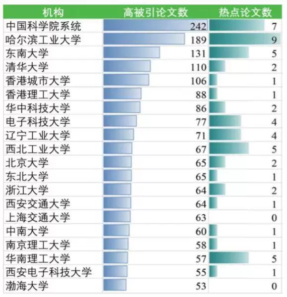 上表列出了中国在人工智能领域发表高水平论文最多的机构,中国科学院以242篇高被引论文和7篇热点论文位居榜首,哈尔滨工业大学、东南大学、清华大学和香港城市大学也都进入了前五名。值得注意的是,辽宁工业大学和渤海大学,在人工智能领域的总体产出虽然不多,但其中的高水平论文比例较高,双双进入了高影响力论文产出最多Top20中国机构的榜单。