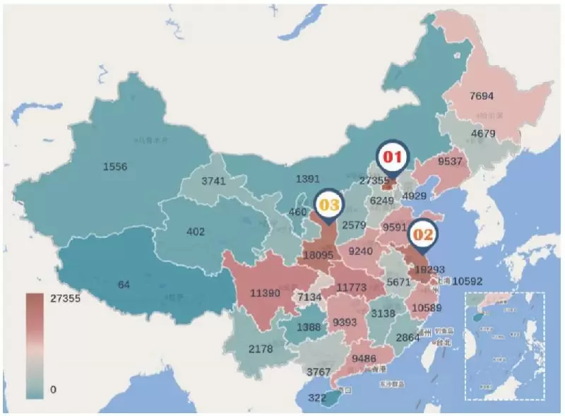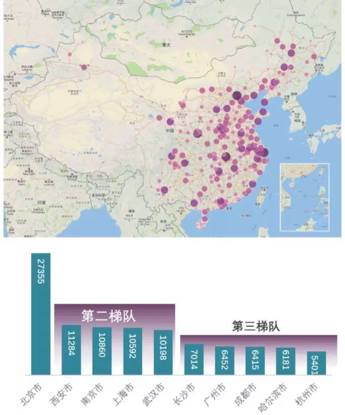 整体来看,东部人才投入呈现北京、江浙沪(合计37624人)双极态势,中部和西部则出现湖北省和陕西省两个高点。