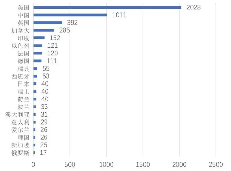 截至到2018年6月,全球共监测到人工智能企业总数达4925家,其中美国人工智能企业数2028家,位列全球第一。中国(不含港澳台地区)人工智能企业总数1011家,位列全球第二,其次分别是英国、加拿大和印度。
