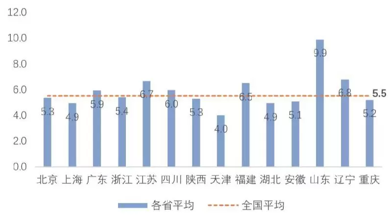 全国人工智能企业的平均年龄为5.5年。其中,北京、上海和天津等地初创企业云集,企业平均年龄相较于全国更年轻,平均年龄在5.5年以下。山东和辽宁等地老牌工业机器人和自动化企业转型较多,企业年龄相对较大。