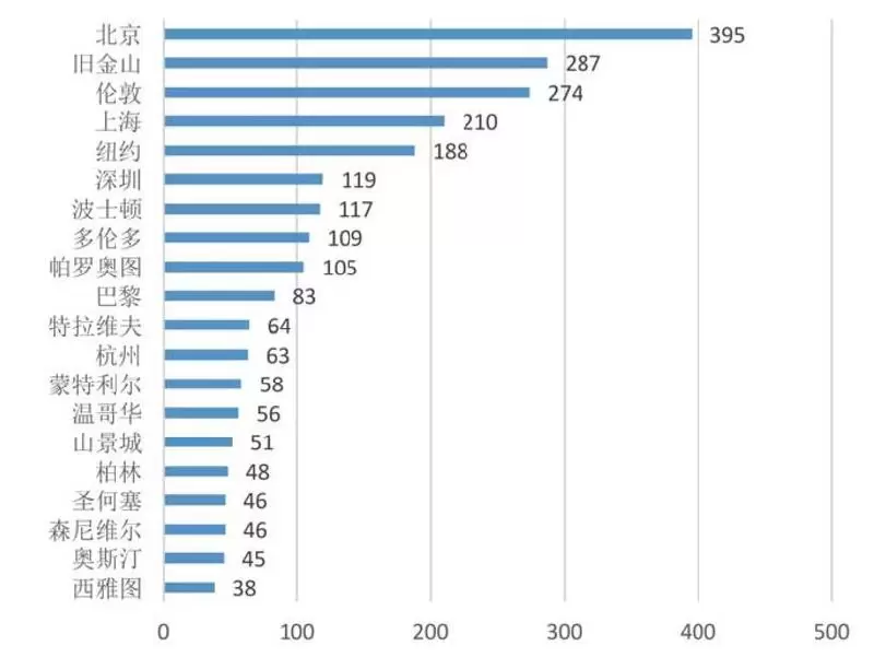 全球人工智能企业数量TOP20城市(单位:家)