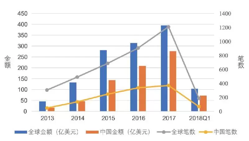 根据2013年到2018年第一季度全球的投融资数据,中国已在融资规模上超越美国成为全球最“吸金”国家,但是在投融资笔数上,美国仍然在全球处于领先地位。