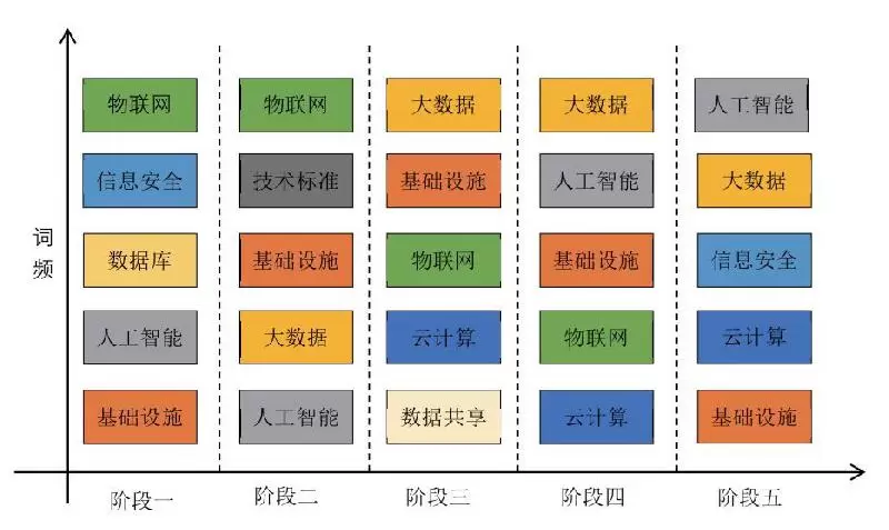 在第二阶段(2013.2-2015.5),人工智能政策主题词频从高到低排序是物联网、技术标准、基础设施、大数据、人工智能。