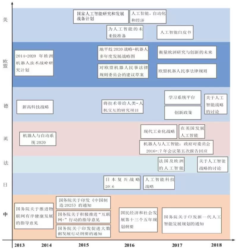 美国发布的人工智能政策着力点在于应对人工智能蓬勃发展的大趋势,欧盟以及德、英、法为代表的欧洲国家,着重关注的是人工智能带来的伦理和道德。日本的人工智能政策发布较晚,政策预期在国家层面建立起相对完整的人工智能研发促进机制。