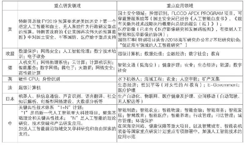主要国家和地区人工智能重点研发和应用领域