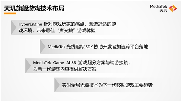 在联发科的规划里,移动端光线追踪技术在智能手机上落地,是分阶段进行的,每一步都极为关键,前后大概需要 3 年或者以上的时间,需要在移动端游戏技术上不断强化。联发科面向未来移动端游戏的布局基本可以概括为以下几点: