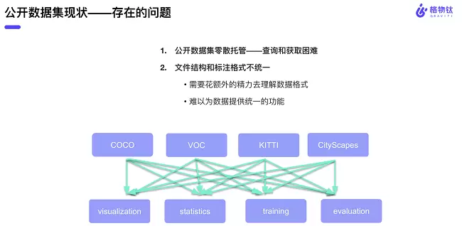 经过很长一段时间的调研,格物钛发现现有公开数据集的存储方式十分散乱,缺乏统一的托管平台,这种各自为战的方式使得不同的数据集提供方会选择使用不同的文件结构和标注方式,这对数据的交换与分享是极为不利的,开发者很难根据自己的任务去精确检索到自己想要的数据集。像可视化、数据标签分布统计这些基础需求的实现都会因为格式不同发生一些变化,算法工程师需要编写更多的胶水代码和新的逻辑去适配这些不同的格式。