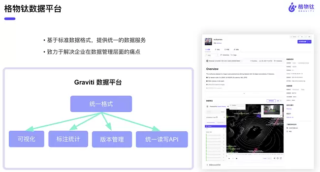 格物钛研究了1200多个公开数据集,从数据格式、标注类型、任务类型以及应用场景这四个方面制定了统一的数据集划分规范和标注格式的基础表示方法。在实施的过程中,格物钛将很多类型的数据集放在了公开数据集社区中,目前为止这套标准也是取得了很多社区成员的认可。在推广公开数据集标准的过程中,格物钛发现数据处理是需要很多基础服务的,这些基础服务可以通过数据平台的形式来实现,去解决企业在数据管理层面的痛点。