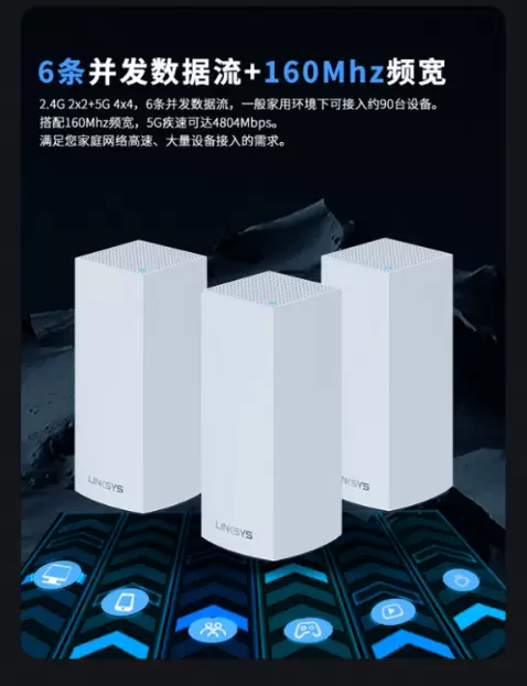 此外,领势MX5500系列的5G频段还支持160MHz频宽重量级升级,并共计拥有6条并发数据流,三只装在家庭环境下可接入约90台设备,满足家庭网络高速、大量设备接入以及智能家居的复杂需求,更加适合当下家庭组网的网络需求。