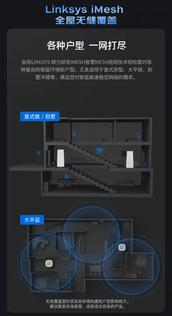 值得一提的是,领势MX5500系列依然延续了VELOP系列产品在MESH组网无缝漫游方面的绝佳体验,全屋无缝MESH网络全覆盖,真正让家庭无线网络的体验更进一步。领势MX5500系列单只最大可覆盖250平方米范围,三只即可轻松满足复式、大平层及别墅户型的网络覆盖,并且领势MX5500系列同样支持无线添加MESH节点,用户可根据需要进行网络拓扑,并结合优秀的无缝漫游技术,为用户保障最佳漫游体验。无论是工作还是娱乐,再也没有信号弱、断联、等待等糟糕的体验,获得绝佳的家庭无线网络全覆盖的无缝漫游体验。