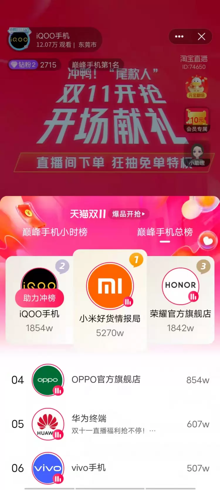 值得注意的是,这并不是iQOO第一次在直播这一新战场上取得亮眼成绩。双十一开门红期间,作为新锐手机品牌,iQOO拿下了天猫双11直播巅峰手机总榜排行TOP2,大促实时累计成交金额突破1亿的好成绩,自播渗透率位居手机行业第一。