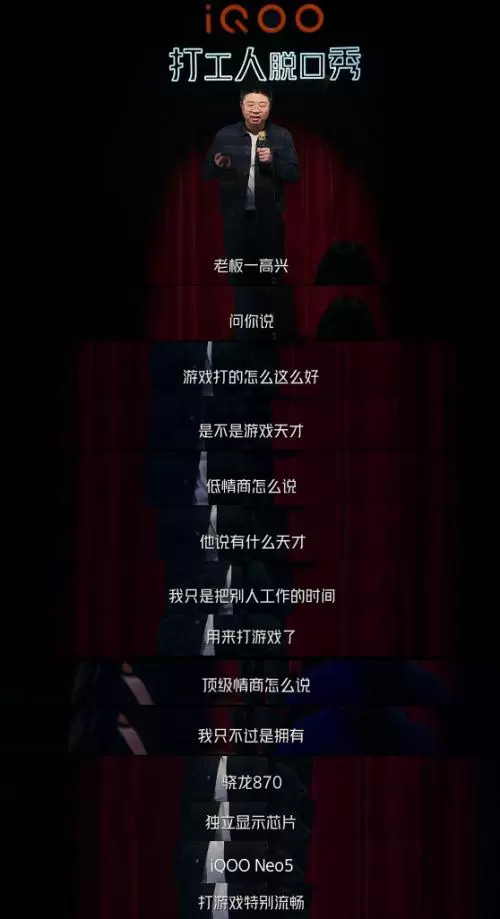 作为新锐品牌,iQOO没有明星品牌代言人,也不怎么投放广告,反而是各种活动玩得风生水起。比如,iQOO Neo5发布之后,邀请脱口秀“小浣熊”呼兰用年轻人喜闻乐见的形式,将iQOO Neo5的产品卖点融入脱口秀段子中。一方面,借助热播综艺的优势进行传播;另一方面,将产品卖点和脱口秀中易于传播的金句相结合,让消费者对iQOO Neo5的性能表现留下了深刻的印象。