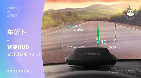 车萝卜智能HUD 蓝牙升级版(BT2),连接车萝卜小蜜APP后,可以将开车时所需要车速、导航、时间、方向等信息整合,投射在视野的正前方且不遮挡视线;亮度高达10000nit,是普通手机的20倍,且可以根据外界光线自动调节亮度;采用思必驰语音交互技术,一语唤醒导航,拨打电话等功能。让你开车不低头,用声音就Go。
