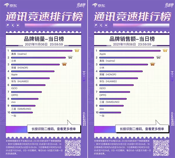 作为2021年最后消费盛宴,京东11.11已于10月31日20点正式开启。从京东手机11.11竞速榜来看,各大手机品牌都卯足了劲儿想在下半年的战局里抢得先手。小米、realme、荣耀、iQOO等品牌表现优异,如今11.11赛程已过半,究竟谁能笑到最后呢,我们拭目以待。