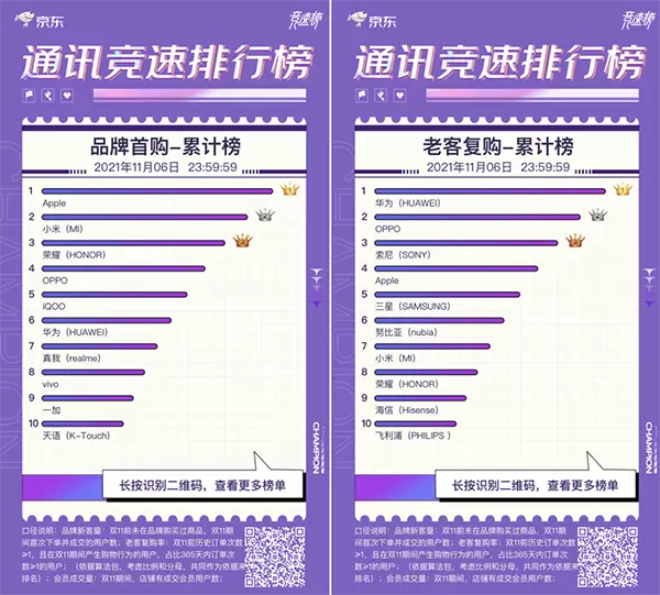 今年京东手机11.11竞速榜还推出了品牌首购、老客复购等榜单,Apple、小米、荣耀位列品牌首购榜单前三;华为、OPPO、索尼位列老客复购榜单前三。从老客复购榜单可以看到,华为用户的忠诚度还是很高的,近几年华为手机在配置、拍照、性能、做工、系统体验等方面,表现都十分优异,受到了诸多消费者的青睐。
