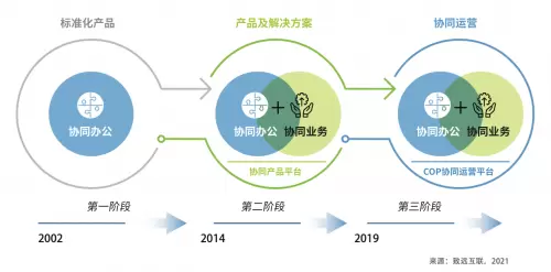 多年来,致远互联以平台化建设思路不断突破,随着对技术的探索和对企业需求演变的洞察,产品与服务先后经历了从标准化协同办公(OA)产品阶段到产品及解决方案阶段,再到今天的协同运营平台(COP)阶段三个重要的发展阶段。
