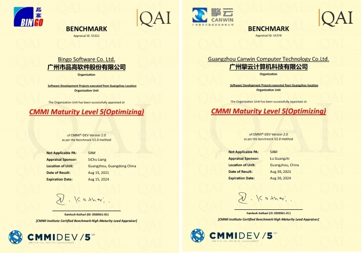 此外,新 CMMI 2.0 版 5 级认证更为关注企业持续改进质量和组织过程性能目标的能力。本次成功通过成熟度最高等级 5 级复评并顺利取得评估证书,体现出品高软件与擎云科技俱已拥有更成熟、更高质量的产品和实力强大的解决方案,并拥有高水平的客户满意度。