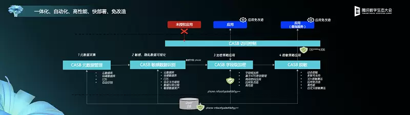 腾讯云方案全代理CASB采用免应用开发改造的配置方式,提供事前敏感数据发现、分类分级;事中加密存储、动态脱敏;事后安全审计的一体化数据安全解决方案,助力企业低成本、高效率地应对数据安全的挑战。